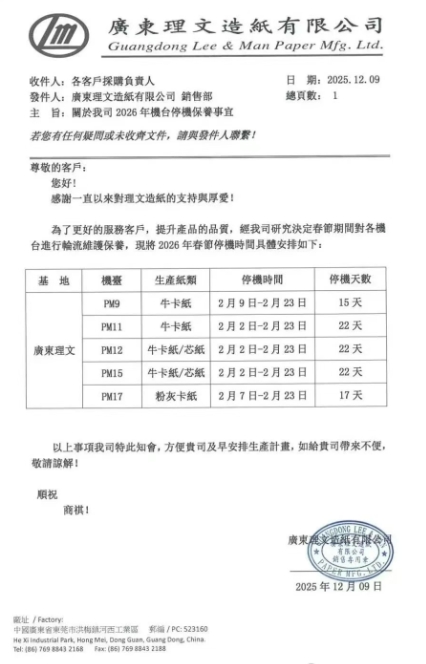 廣東理文:5臺紙機將在2月停機15-22天,預(yù)計減產(chǎn)箱板瓦楞紙9.3萬噸和3萬噸灰底白板紙。