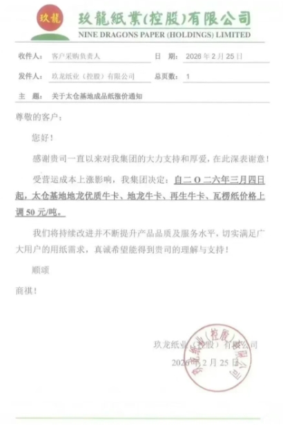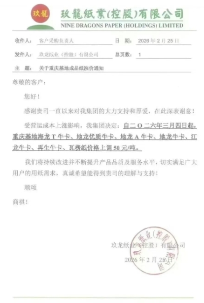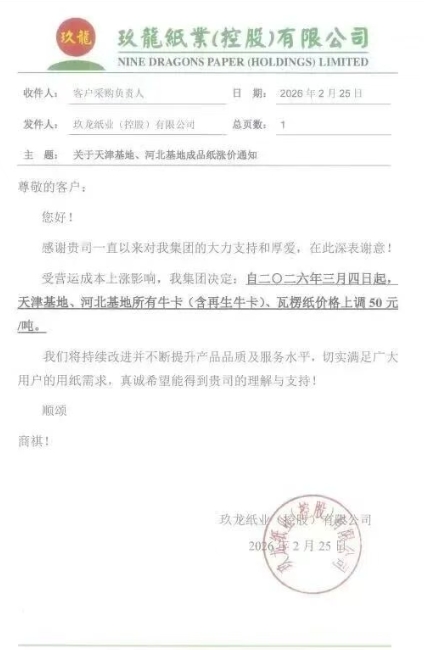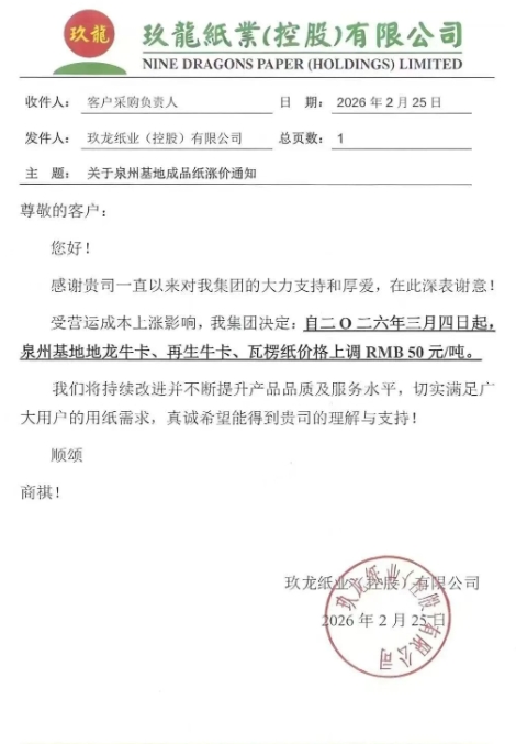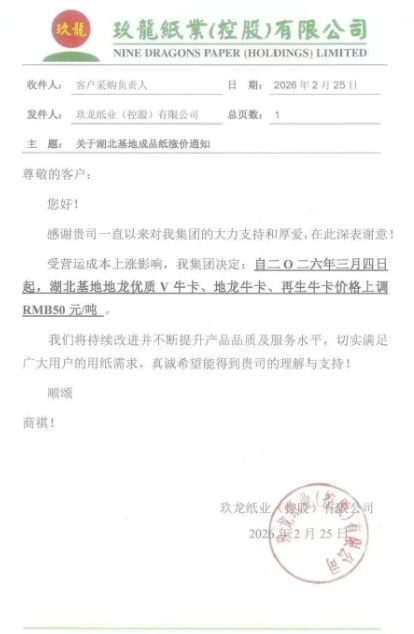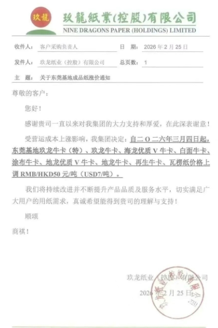 東莞玖龍:3月4日起,玖龍牛卡(特)、玖龍牛卡、海龍優質V牛卡、白面牛卡、涂布牛卡、地龍優質V牛卡、地龍牛卡、再生牛卡、瓦楞紙價格上調50元/噸。