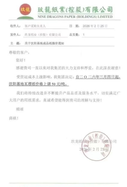 沈陽玖龍:3月4日起,瓦楞紙價格上調50元/噸。