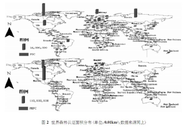 從圖1可以看出,雖然中國森林面積位居世界第五,低于俄羅斯、巴西、加拿大和美國。但是中國森林認證面積和認證比例卻遠低于德國、 英國、加拿大、法國和美國等發達國家,也低于南非、巴西、俄羅斯等發展中國家。 是世界上各國森林認證面積分布見圖2。從圖2可以看出,世界森林認證面積主要分布在北美和歐洲地區,其中FSC認證的范圍最廣,PEFC認證的面積最大。