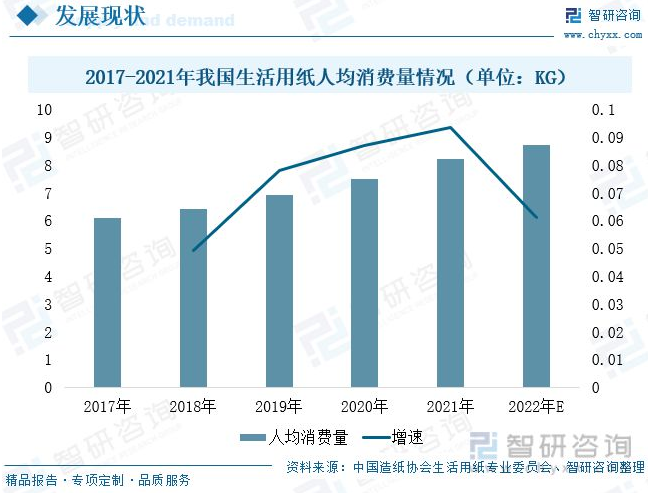 我國是全球最大的生活用紙消費國,生活用紙總體消費規(guī)模龐大,但人均消費量相對較低,人均生活用紙消費量遠低于美國等發(fā)達國家。2022年我國生活用紙人均消費量約為8. kg,同比增長6.1%;與美國的29kg、西歐及日本的16-17kg的人均相比,國內生活用紙人均消費量仍有很大的提升空間。整體來看,在未來相當長的一段時間內,我國造紙設備行業(yè)將保持較高景氣,行業(yè)需求潛力巨大。