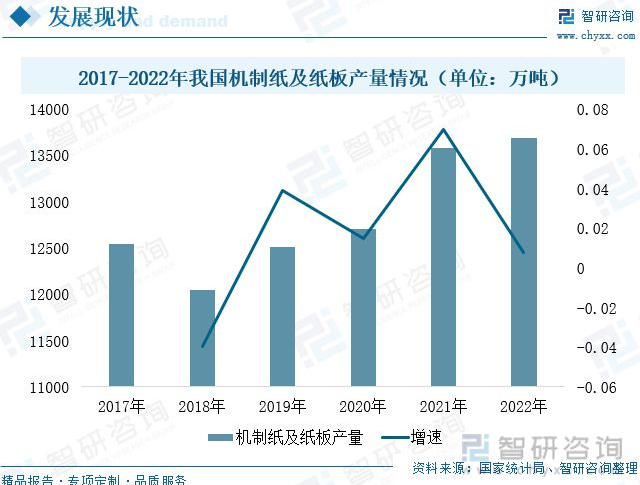 機制紙及紙板廣泛用于多個領域,國家統計局數據顯示,2018-2022年,我國機制紙及紙板產量穩(wěn)步上漲。2022年全國生產機制紙及紙板13691.4萬噸,同比增長0.79%,行業(yè)延續(xù)增長態(tài)勢,國內巨大的紙張需求為造紙設備提供了廣闊的發(fā)展空間。