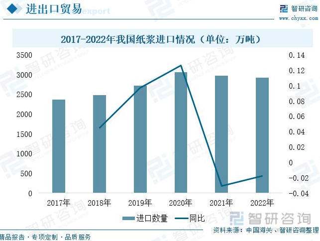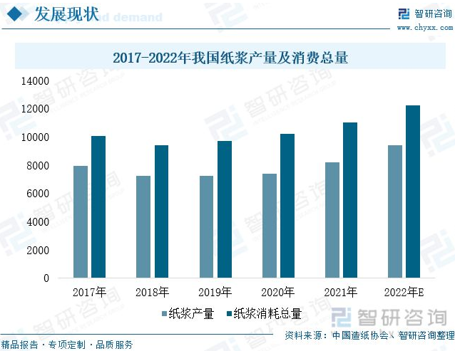 三、下游市場穩(wěn)健發(fā)展,行業(yè)需求潛力巨大 下游市場對造紙設備行業(yè)發(fā)展具有重要促進作用,下游產業(yè)不斷擴張有利于本行業(yè)市場開拓與產品研發(fā)。其中,紙漿是造紙工業(yè)中最重要的原材料,紙漿生產設備品類較多,主要包括磨漿機、分切復卷機、干燥漿板機、壓縮機等多個造紙設備。2017-2022年,我國紙漿產量及消費量不斷增加。2021年我國紙漿產量及消費總量分別增長10.83%和7.94%。2022年隨著下游用紙需求不斷增加,紙漿產量及消費量延續(xù)增速,同比增速約為15%和10.85%。未來,隨著國內制漿生產線規(guī)模不斷擴大及對制漿質量要求不斷提高,紙漿制造設備需求將進一步上漲。