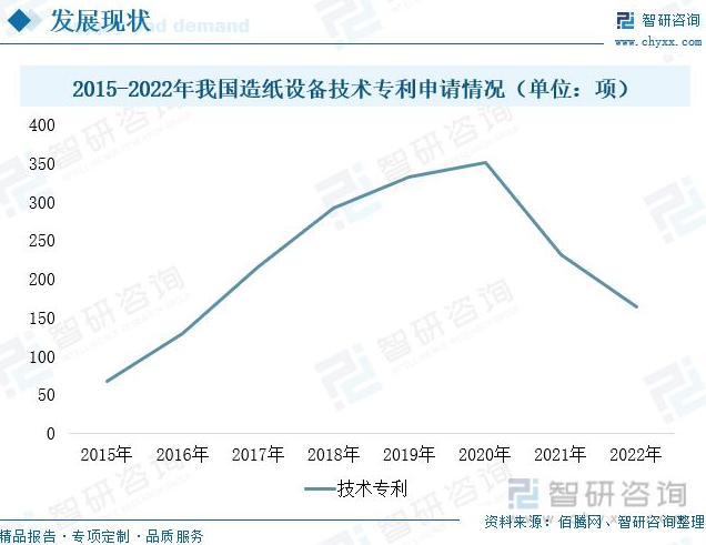 造紙設備是專業(yè)性很強的行業(yè),涉及機械、化工、材料、防腐等多個技術性領域。我國造紙設備行業(yè)發(fā)展歷程較短,行業(yè)整體技術水平相對滯后,市場規(guī)模較小。從國際市場看,造紙設備生產商主要集中在德國、美國、意大利、日本等制造業(yè)發(fā)達地區(qū),與國際造紙設備領先企業(yè)相比,國內造紙設備供應商在規(guī)模、技術以及質量方面,都存在較大差距,長期以來大型造紙機械設備均依賴進口。近年來,國家出臺了多項推動造紙行業(yè)技術及設備創(chuàng)新發(fā)展及綠色轉型政策。其中,為了提高我國造紙機技術水平,加快大中型造紙機國產化進程,國家還安排了國債支持的技術改造資金,以引進部分技術項目。在“制造強國”戰(zhàn)略及相關政策引導下,造紙設備行業(yè)參與者逐漸增多。隨著造紙設備生產商紛紛加大研發(fā)力度及航空、造船等跨行業(yè)投資者參與布局造紙機械設備的研發(fā)生產,行業(yè)技術水平逐步提高。截至2022年底,我國合計擁有2273想造紙設備相關專利,其中實用新型專利1670項,發(fā)明專利578項。其中,2022年新增造紙設備專利164項。并研發(fā)創(chuàng)新了廢紙制漿成套技術裝備、鼓式碎漿機、新型封閉篩選設備、雙盤磨漿機、超級壓光機等多種設備,設備國產化進程不斷加快。2022年我國新增造紙設備技術專利164項,較前兩年略有下滑,但與2016年之前相比仍處于較高水平,行業(yè)研究開發(fā)加快。近幾年,隨著造紙設備水平不斷提高,我國市場份額也在逐漸提升。預計,2022年我國造紙設備市場份額占全球總份額將提升至28%左右,行業(yè)國產化進程也將進一步加快。