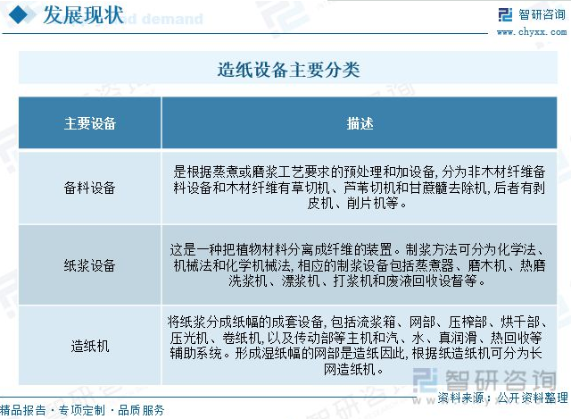 相關報告:智研咨詢發(fā)布的《2023-2029年中國造紙設備行業(yè)運營現狀及市場分析預測報告》 二、行業(yè)自主創(chuàng)新能力不斷加強,設備國產化進程加快 造紙產業(yè)是與國民經濟和社會事業(yè)發(fā)展關系密切的重要基礎原材料產業(yè),紙及紙板的消費水平是衡量一個國家現代化水平和文明程度的標志。造紙設備作為造紙產業(yè)中游領域重要細分市場,其技術水平關乎到行業(yè)整體發(fā)展水平。 造紙設備主要包括粉碎設備、傳輸設備、濕漿機,擠水機、折疊機、破碎輸送機以及打包機等。根據紙漿造紙的工藝流程,造紙機械可以分為備料設備、紙漿設備、造紙機及整飾加工機械。其中,備料設備是在蒸煮或磨漿前,按蒸煮或磨漿工藝要求進行預處理和加工的設備,分為非木材纖維備料設備和木材纖維備料設備,包括切草機、切葦機、剝皮機、削片機等。制漿設備是將植物原料分離成纖維過程所用的設備,包括蒸煮器、磨木機、熱磨機、洗漿機、漂漿機、打漿機和廢液回收設備等。造紙機全套設備包括流漿箱、網部、壓榨部、烘干部、壓光機、卷紙機,以及傳動部等主機和水、真空、潤滑、熱回收等輔助系統。