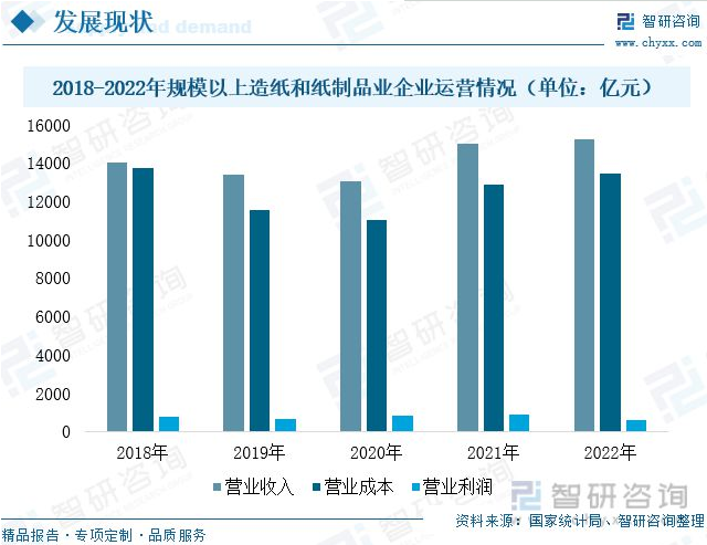 行業(yè)營業(yè)收入穩(wěn)步增長。造紙行業(yè)與國民生活息息相關,2018-2022年,我國造紙行業(yè)市場規(guī)模穩(wěn)步增長。2020年受新冠疫情影響,造紙行業(yè)景氣度整體處于較低水平,行業(yè)收入下降2.67%。2021年國內經濟恢復向好,我國規(guī)模以上造紙和紙制品業(yè)營業(yè)收入增長15.32%,營業(yè)利潤增長7.03%。2022年國內經濟受疫情沖擊較大,行業(yè)未來供應鏈受阻,規(guī)模以上造紙和紙制品業(yè)營業(yè)收入增速放緩,同比增長0.4%,較2021年減少14.92個百分點;利潤方面,受俄烏沖突影響,國際能源價格大幅提升,行業(yè)生產成本隨之增加,行業(yè)運行壓力較大,規(guī)模以上造紙和紙制品業(yè)營業(yè)利潤為621億元,同比下降29.80%。展望2023年,隨著“穩(wěn)增長”政策落地節(jié)奏加快,市場主體活力有望被進一步激發(fā),行業(yè)收入及利潤有望上漲。