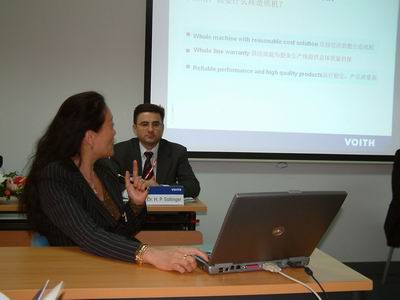 Voith造紙技術中國區總裁劉明明女士演講中國需要“同一供應商提供整臺紙機”的解決方案